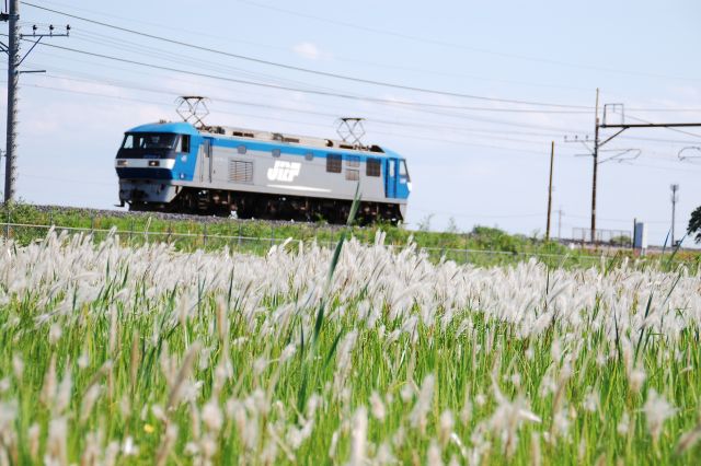 機関車が単機でトコトコでやってきたので手前の綿毛を入れて一枚。